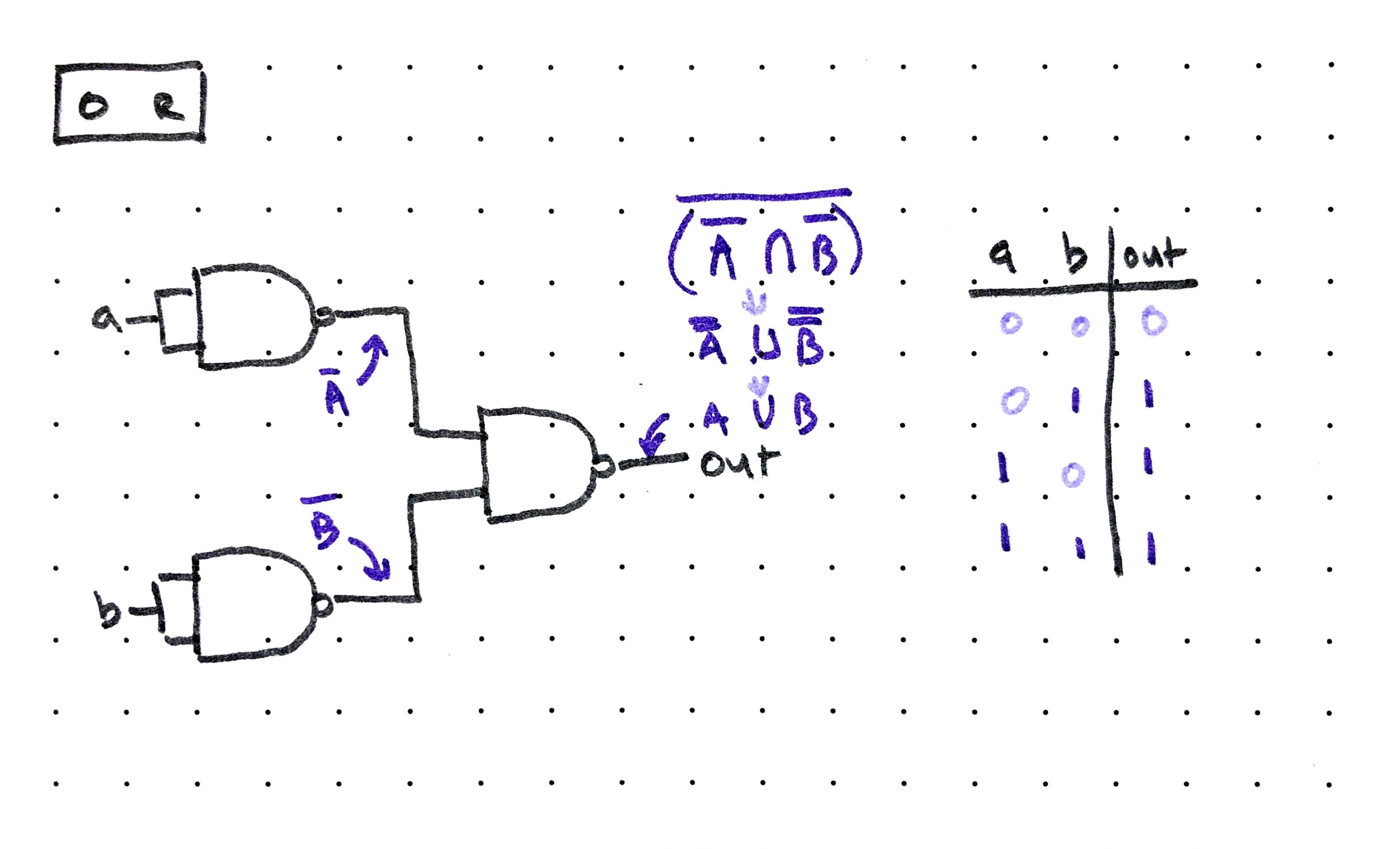 I spent a lot of time today drawing out various logic gates schematics. Too much time. I hadn’t known that NAND logic is so magical and that it’s possible to derive all other logic gates from combinations of NANDs, but now that I do I can’t get enough NAND.