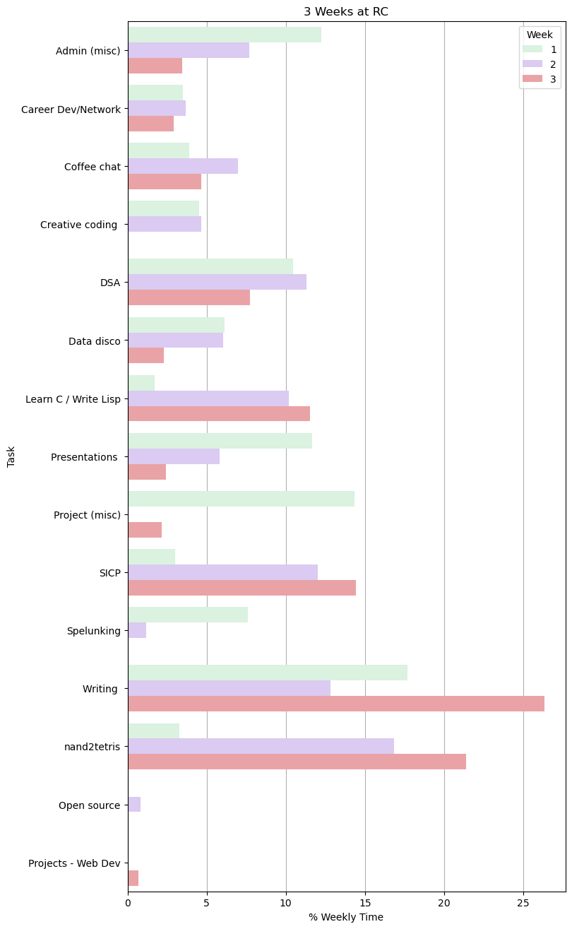 So, as you can imagine, I have amassed some interesting data about how my time has been spent at RC, and now, 25% into my batch, seems like a grand opportunity to evaluate it and ensure I’m allocating my time in the service of my goals.